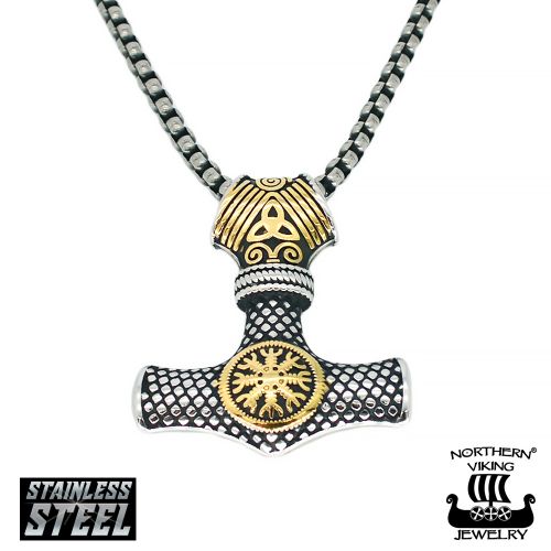 Northern Viking Jewelry®-kaulakoru Thorin Vasara Helm Of Awe Kulta yhdistää kaksi muinaista viikinkisymbolia. Mjölnir, Thorin vasara, edustaa voimaa, rohkeutta ja suojelua. Sen pinnalla loistaa Helm of Awe (Ægishjálmur) – voimakas riimusymboli, jonka viikingit uskoivat tuovan kantajalleen voittoa ja pelottomuutta taistelussa.