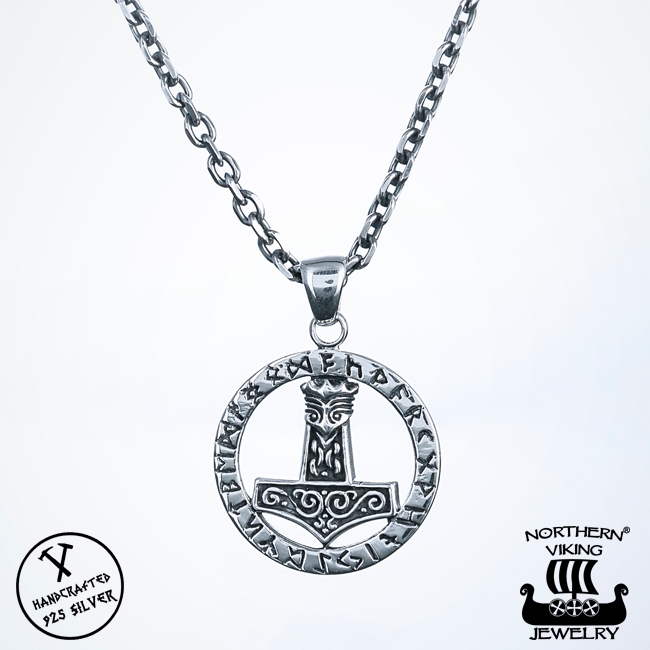 925-Hopeasta valmistettu Thorin vasara-riipus. Riipuksen ulkoreunaa koristaa riimukirjoitus. Hinta sisältää 925-Hopeasta valmistetun riipuksen.