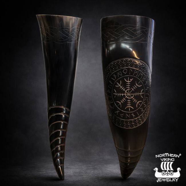 Ilta laskeutuu pitkän talon ylle. Tuli rätisee keskellä salia, ja savun seassa leijuu paahdetun lihan ja hunajan tuoksu. Kilvet on nostettu seinille, miekat nojaavat penkkeihin. Kun torvet soivat ja juoma kiertää, käsiin nousevat juomasarvet – luonnon muovaamat astiat, joista on juotu jo ennen kuin rautaa osattiin takoa. Viikinkien juomasarvet valmistettiin sarvesta, sillä puu halkeili ja metalli oli harvinaista. Sarvi piti juoman viileänä ja kesti matkat merillä ja metsissä. Sillä kohotettiin malja jumalille, vannottiin valoja, juhlistettiin voittoja ja hyvästeltiin kaatuneet. Juomasarvi ei ollut vain astia, vaan osa rituaalia – merkki yhteydestä esivanhempiin ja tarinoihin, jotka kulkivat suusta suuhun.Tämä käsityönä valmistettu juomasarvi jatkaa tuota perinnettä. Jokainen sarvi on yksilö, luonnon itsensä muovaama.. Kun nostat sarven huulillesi, pidät kädessäsi jotain ajattomampaa kuin pelkän juoma-astian: palan pohjoista tarinaa.