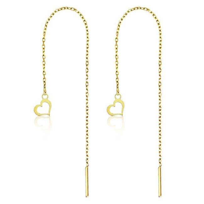 Ketjukorvakorut Teräs Sydän Kulta ovat kevyet ja elegantit ketjukorvakorut, joita koristaa herkkä sydänriipus. Kullanvärinen ruostumaton teräs tuo kestävää kiiltoa ja ajattoman ilmeen. Täydellinen valinta arkeen, juhlaan ja romanttiseen tyyliin. Mukana 2 kpl läpinäkyviä korvakorun taustoja