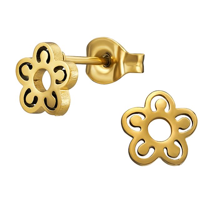 Kultaiset kukka korvakorut 7x7 mm – kevyt ja kestävä teräs, tyylikäs ja ajaton design. Sopii arkeen ja juhlaan,