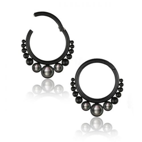 Mattamusta septum-rengas, jossa on sulava saranamekanismi ja helmiäiskoristelu.