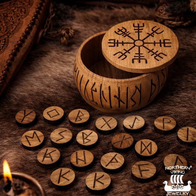 Tyylikäs Vegvísir puinen riimukulho sisältää 24 Elder Futhark riimua. Kulhon kannessa oleva Vegvísir – viikinkien kompassi – symboloi suojaa ja oikeaa suuntaa elämässä.